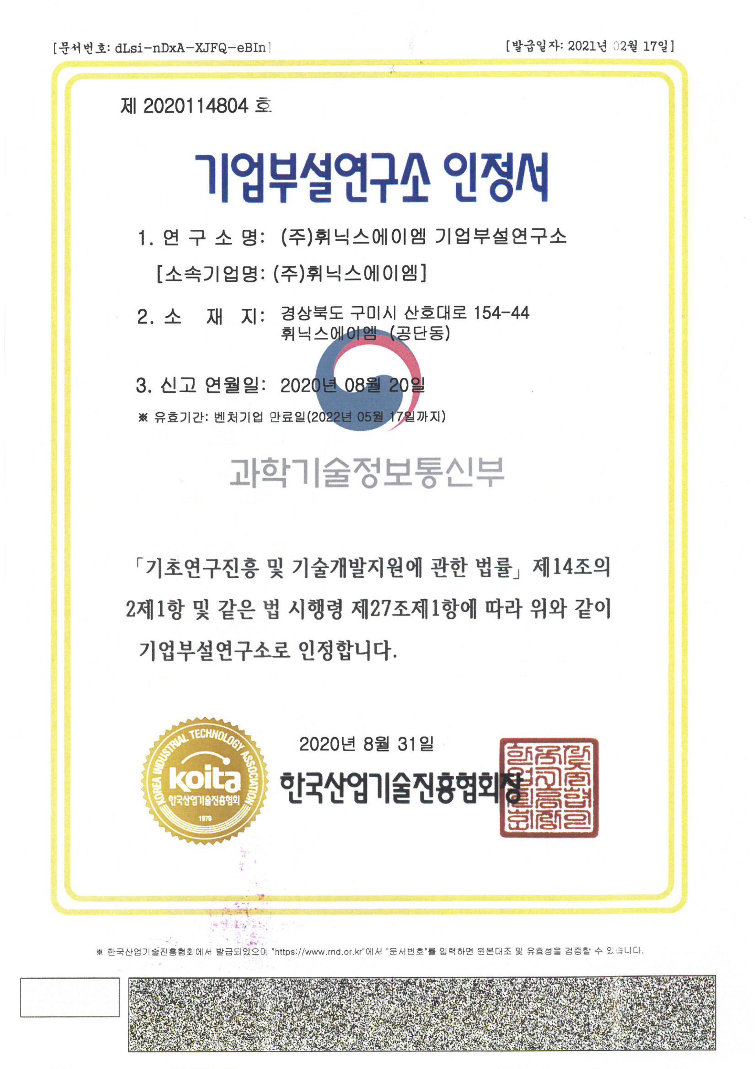 기업부설연구소 인정서